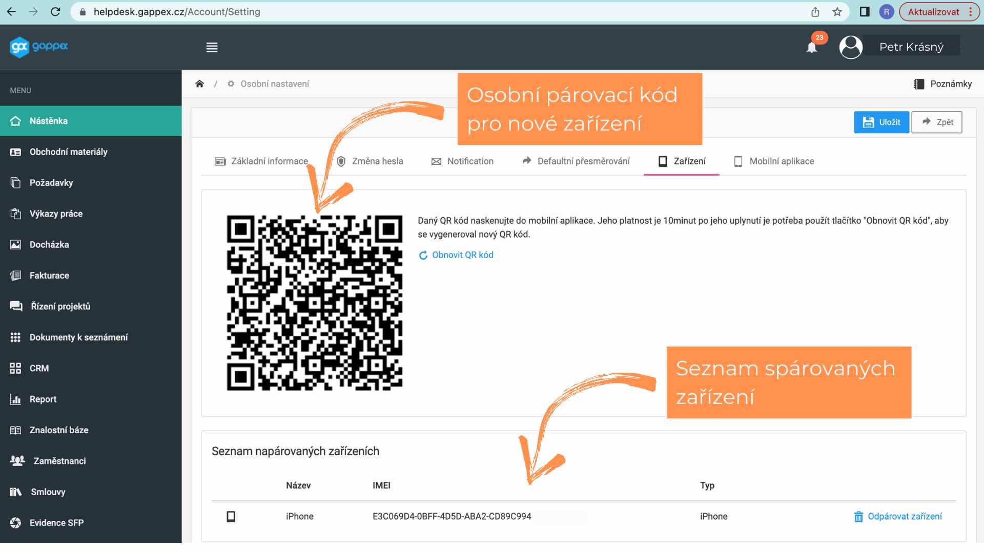 Na PC v sekci "Nastavení" najdete záložku "Zařízení", kde máte vygenerovaný osobní párovací QR kód. Poté, co si stáhnete aplikaci a kliknete na tlačítko přihlášení pomocí QR kódu, jednoduše kód sejmete a jste přihlášeni v systému.